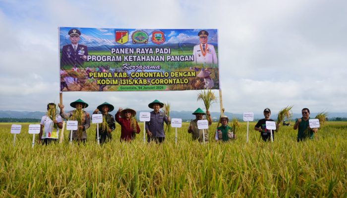 REALITAS.CO.ID – Komando Distrik Militer (Kodim) 1315/Kabupaten Gorontalo bersama Pemerintah Kabupaten Gorontalo, menggelar panen raya padi di Desa Bongomeme, Kecamatan Dungaliyo, Minggu (4/01/2026).
